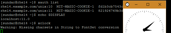 #xauth add “rhel4.example.com/unix:11 MIT-MAGIC-COOKIE-1 821926769b3de22cb2f9af658a38bb16”